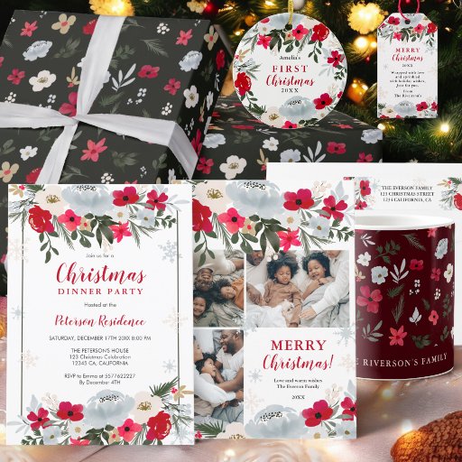 This wraparound address label is a festive and elegant way to add a personalised touch to your holiday mailings. The design features a beautiful floral arrangement in vibrant shades of red, white, and soft green, complemented by delicate winter botanicals like pine sprigs. The floral elements are set against a crisp white background, creating a fresh and modern look that enhances the festive spirit of the season. The label includes ample space for your return address on one side and a "Merry Christmas" greeting on the other, making it both functional and stylish. Ideal for Christmas cards, holiday invitations, and gift packages, this label adds a cohesive and polished finish to your holiday correspondence.