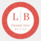 This elegant wedding sticker features a circular design with a textured red background and crisp white text. The initials "L" and "B" are prominently displayed in bold serif font, separated by a vertical line, while the phrase "THANK YOU" is written below in a slightly smaller typeface. The overall layout is symmetrical and balanced, creating a harmonious composition that conveys gratitude and formality. Perfect for expressing thanks at your special event, this sticker combines classic style with a polished tone, making it an ideal choice for any formal occasion.