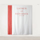 This wedding backdrop features a minimalist design with a striking vertical split. The left side showcases a textured red panel with intricate leaf or feather patterns, while the right side offers a clean white background for contrast. Elegant typography in serif and script fonts highlights the names, creating a sophisticated yet simple look. The warm color palette of reds and whites evokes feelings of love and celebration, making it perfect for a romantic wedding setting.
