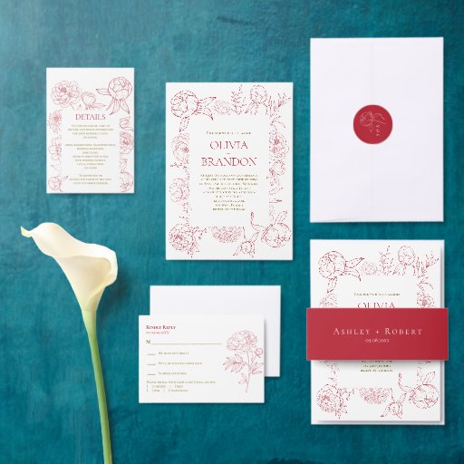 A red peony line drawing makes an elegant statement for your wedding. You may personalise with your information and change the colour to suit your event.