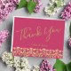 Modern and Elegant wedding thank you postcard features a red purple / magenta background (2022 Pantone colour pick "innuendo") with gold lettering and filigree bottom border