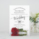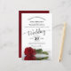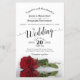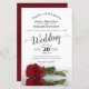This beautiful wedding invitation features a romantic design with a single long stemmed red rose laying on its side and reflecting in a pool of water. The typography features lacy script calligraphy and a sophisticated layout. The back is a deep marbled red color. Wonderful way to invite your friends and family to share in your joy on your special day.