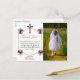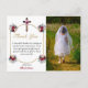 Give thanks to your family and friends for attending your child's holy communion with this Elegant Red Rose Floral Girls 1st Holy Communion Photo Thank You Postcard. This design features a simple white background on the front of the card and you can personalise with a photo of your child. A beautiful wooden cross with a red and pink floral bouquet sits complements a gold frame adorned with red and pink rose bouquets in each corner. Put a thank you message and signature your family or your child. There's a place to put your return address on the back for your convenience.