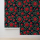 A seamless floral pattern featuring vibrant red roses in full bloom, surrounded by lush green leaves. Set against a deep black background, the striking contrast enhances the elegance and romance of the design, making it perfect for textiles, wallpapers, or decorative prints.