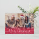 Modern Elegant Red White Snowflake Script One Photo Merry Christmas Script Holiday Card. This festive, simple, minimalist, cute whimsical 1 photo holiday greeting card template features „Merry Christmas” greeting text which is written in a hand lettered swirly swash-tail font calligraphy script photo overlay. On the back side cute white snowflakes or snowy background on red background. This Cute Custom Personalised Photo Christmas Cards are a great way to remind loved ones that you're thinking of them this Winter Holiday Season.