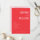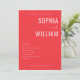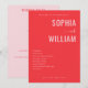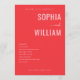 This wedding program features a bold, minimalist design with a vibrant red background that creates a striking contrast against the white text. The layout is clean and modern, emphasizing typography to highlight the names "Sophia" and "William" in large, elegant fonts, while ceremony details are neatly organized below. The overall style is simple yet sophisticated, perfect for couples seeking an understated yet impactful aesthetic for their special day. Customizable elements allow for personalization of dates and locations, making it ideal for any wedding celebration.