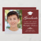 Send your family and friends a unique personalised photo graduation card featuring your custom photo on the left and to the right a white grad cap with the word "Graduate", class/year, name and other ceremony details in formal white script calligraphy to personalise on a red maroon background. Designed by ©Susan Coffey.