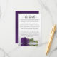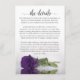 This beautiful wedding enclosure card is designed to give you extra space for whatever information your guests may need, including website, registry, reception, travel, accommodations, or any other details. The card features a gorgeous design with a single reflecting deep royal purple coloured rose and a lacy script calligraphy title reading "the details." The back is a deep marbled purple or violet colour.
