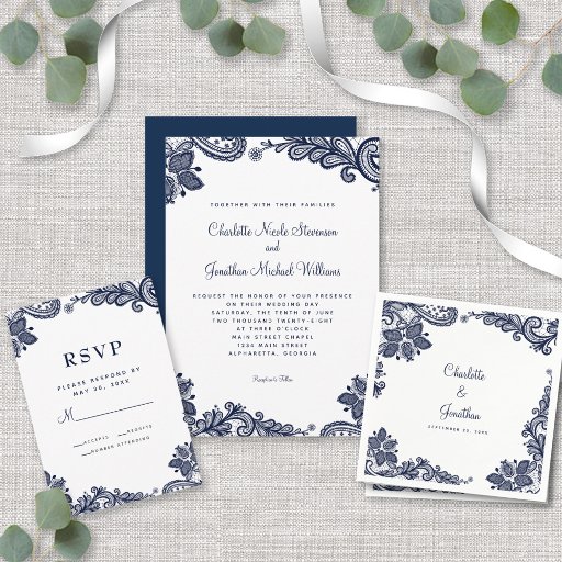 Elegant romantic lace engagement party invitation design features a crisp white background with ornate navy blue faux lace in the corners on back and front. Personalise the design with your details in trendy lettering and script in classic navy blue. The back matches in trendy navy blue. For best results replace template details with your own details leaving space between paragraphs as in the example. E-mail invitationsuites@gmail.com with questions or custom colour requests.