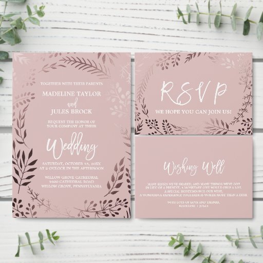 This elegant rose gold and pink round wedding invitation card is perfect for a classy wedding. The design features a stunning faux rose gold foil leafy frame on a blush pink background and is paired with a dazzling cursive font.