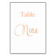 The table number is written with an elegant hand lettered style script. Rose gold letters, white background. This table number is also available in black.