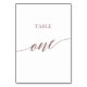 This elegant rose gold calligraphy table one table number is perfect for a simple wedding. The neutral design features a minimalist card decorated with romantic and whimsical faux rose gold foil typography. The card prints on the front and back (double-sided). Other table numbers in the collection are sold separately.