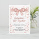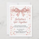 "Celebrate friendship in style with this chic 'Galentine's Get-Together' invitation design. The card features a stunning, realistic pink satin bow at the top, cascading into a shower of rose gold glitter and soft pink hearts. Set against a clean white background, the typography blends elegant script with modern serif fonts to create a warm and inviting atmosphere. Perfect for a girls' night out, brunch, or an evening of bubbles and sweet treats on February 13th. This design captures the essence of feminine elegance and festive fun
