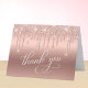 Chic folded thank you card for your 60th birthday party featuring "Thank You" in elegant white calligraphy, a rose gold faux foil background and rose gold faux glitter. On the inside, personalise your thank you message and signature or leave blank for a handwritten note.