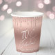 Chic personalised paper cups for her 70th birthday party featuring "70 & Fabulous" in a white calligraphy script against a rose gold background with rose gold faux glitter drips.