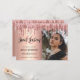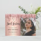 This modern invitation design features faux pink & copper rose gold dripping glitter metallic texture and elegant calligraphy font. Add your favourite photo.