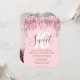 This modern invitation design features faux rose gold dripping glitter, pink background and elegant calligraphy font. Add your favourite photo.