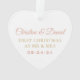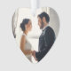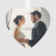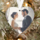 Elegant heart shaped holiday keepsake ornament for a newlywed couple features a wedding portrait on the front with custom script monogram and "First Christmas as Mr. & Mrs." wording on the back. The white, rose gold, and gold colors on the back can be customized.