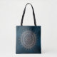 Gorgeous circular floral mandala art tote bag in luminous rose gold on deep teal background, inspired by mehndi henna body art. Great for carrying your things to yoga, dance class or the gym.