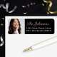 Simple and elegant custom address label design features a senior photo of your graduate with blush pink / rose gold and white return address text and black background. Colours can be customised.