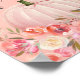 Enjoy this elegant, autumn, floral baby shower for a baby girl. Pinks, corals, and yellow florals with a blush pink background. "Food" script above pumpkin. String lights at top and pink ribbon wrapped around pumpkin stem.