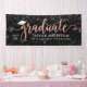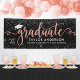Celebrate your graduate with this elegant graduation party banner featuring a flowing rose gold script "Graduate" centerpiece on a sophisticated black background with subtle sparkle details. The graduate's name and school appear in clean serif type alongside a graduation cap and "Class Of" lockup. The luxe design works beautifully as a backdrop for graduation party tables, photo walls, or open house celebrations. Easily personalise with the graduate's name, school, and class year to make it your own.