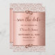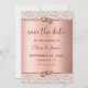 Announce your upcoming wedding in glam style with this elegant rose gold save the date card. The card features trendy script typography, and the top and bottom are framed with rose gold glitter damask.