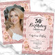 Elegant, floral, feminine 50th birthday invitation with your photo at the back of the card. Glam white, blush pink design with faux glitter rose gold. Features stripes, roses, script font and confetti. Perfect for a stylish adult bday celebration party. Personalise with your own details. Can be customised for any age! Printed Zazzle invitations or instant download digital printable template.
