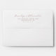 This wedding envelope features a minimalist and elegant design with centred text elements on a soft, neutral off-white background. The typography includes a flowing script font for the names, paired with a smaller serif font for the address, creating a sophisticated and romantic look. The muted rose pink colour adds a gentle touch, enhancing the timeless appeal of this classic style. Perfect for couples seeking simplicity and grace in their wedding stationery, this design conveys warmth and intimacy through its clean lines and subtle contrast.