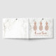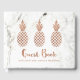 This stylish guest book features faux rose gold look (not actual gold foil) pineapples on a white marble look background. The book says "Guest Book" in trendy typography, and has a spot for you to add the title of your event.