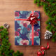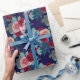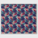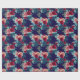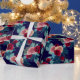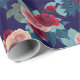 Elegant wrapping paper in navy blue with a floral pattern strewn over it. Roses of peach and pink along with deep red peonies dance in beds of sage, mint and deep blue leaves.