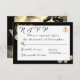 Design features an elegant black background with sepia roses surrounding a white rectangle displaying text. Text is displayed in the proper format for a response card. Back displays a large image of a beautiful sepia rose against a black background. A golden cross intertwined with two wedding rings is featured in top right corner. Gorgeous design is very pleasing to the eye.