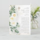 Elegant and classy white rose and eucalyptus floral prayer card design with dark gold-toned confetti and shadowing and a sepia gold-toned simple cross. Back features a watercolor gradient sage green background with green and sparse dark gold-toned confetti splatters.