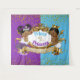 Elegant Royal Gender Reveal Design. Adorable African Prince with gold crown, white diaper and blue slippers alongside a Beautiful African Princess in Afro Puffs wearing a purple tutu dress and shiny diamond tiara. Purple and Blue colour block background. Shimmering gold glitter confetti. Customise banner with your own text. ©2022 Miss Sassy Party Designs