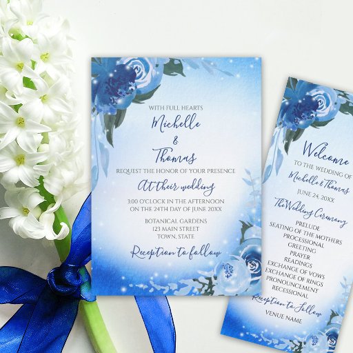 This elegant royal blue watercolor floral and greenery wedding program is perfect for your special day. The design features a light to royal blue gradient watercolor wash, royal and dusty blue peonies and roses, a spray of stems greenery and leaves, and a cluster of light and starlight. Elegant and delicate fonts grace the program. This design theme is perfect for your garden, rustic, elegant, botanical, vintage, country, spring, summer, mountain, barn or destination wedding. View the complete collection on our page for matching items that fulfil all of your wedding suite needs.