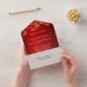 Your guests will love this all in one wedding invitation. An elegant ruby red with gold swirls. This includes your RSVP, that the guest can remove and mail back to you. Simply add your names and wedding details. Further customise, with the menu options on the RSVP portion. On the reverse you will add your name and address twice. One will go on the outside flap, and the other on the RSVP card.