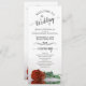 This beautiful wedding program features an elegant design with a single long stemmed rust orange coloured rose lying on its side reflecting in water. The titles are written in fancy script calligraphy, and there is space for your ceremony and wedding party details, as well as a short thank you for your guests. Wonderful way to welcome your friends and family to your wedding celebration.