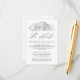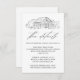 Rustic wedding details card featuring a black sketched illustration of a barn displayed at the top with a white background. The barn wedding details cards feature elegant black calligraphy elements throughout the design. Personalise the black and white barn details cards with important information such as hotel accommodations, group codes for discounted rates, transportation information, directions, welcome reception information, and your wedding website. Designed to coordinate with our Elegant Rustic Barn wedding collection.