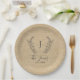 Custom monogram and name with family established year elegant chic country farmhouse style beige ochre burlap paper plates. +++++++ A modern keepsake gift party table decor for weddings, family anniversaries, housewarmings, Thanksgiving, Christmas, or any other occasion.