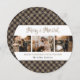 Elegant rustic plaid photo newlyweds Christmas cards featuring a snowy black and khaki buffalo plaid background with 3 photos in the middle and a beautiful hand-lettered script title above. Easily personalise this plaid merry and married Christmas card with your images, text, and your family name.
