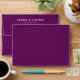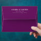 This elegant wedding envelope features a rustic yet modern design. A deep purple exterior provides a rich backdrop for a delicate floral arrangement of blush and purple roses nestled inside the flap. The bold purple and soft floral design combination creates a sophisticated and romantic feel, perfect for wedding invitations or other special occasions.