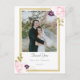 A simple, classy, elegant wedding thank you postcard featuring a wedding photo, modern script calligraphy and a classic, simple but modern gold frame with two roses, pink and purple, painted in watercolor and graphite.