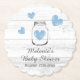 Elegant rustic wood baby shower party coasters. Custom design with white wood grain panel and little faded hearts in light pastel blue colour. Classy script typography with cute love symbols and rustic mason jar drawing. Trendy country chic style designs for fun gathering. Part of matching collection suite including trendy invites and pretty decorations.
