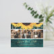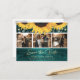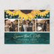 Personalised teal and sunflower wedding photo save the date postcards with an elegant faux gold foil script font. Our wedding save the date features a photo collage of 3 images against a teal rustic wood background adorned with string lights. Easily personalise this rustic sunflower photo save the date postcard with your images and wedding details including a wedding website, if desired.