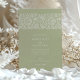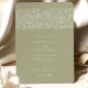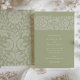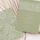 This elegant wedding invitation features a refined sage green background with intricate ivory floral patterns, offering a perfect blend of sophistication and modern style. The delicate floral motifs on both the front and back of the card create a cohesive and luxurious look, making it an ideal choice for couples seeking a timeless yet contemporary design. The invitation is beautifully complemented by the inclusion of subtle monograms, adding a personal touch to this stunning piece. Perfect for formal weddings, this invitation will set the tone for an elegant and memorable celebration.