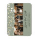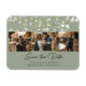 Elegant personalized sage green wedding photo save the date magnet with modern calligraphy. Our wedding save the date features a photo collage of 3 images against a sage green background adorned with string lights. Easily personalize this card with your images and wedding details. For custom requests, please send us a message via Zazzle chat.