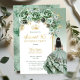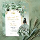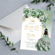Elegant and classy sage green with gold-tone accents floral bough combined with an arched panel on a faded sage green background "Sweet 16" party design. Features a dark brown to black-haired brunette beauty in a flowing sage-coloured ball gown and a faux alcohol and ink marbled back. Composite design by Holiday Hearts Designs.