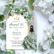 Elegant and classy sage green with gold-tone accents floral bough combined with an arched white and gold-tone panel on a clear background "Sweet 16" party design. Features a dark brown to black-haired brunette beauty in a flowing sage-coloured ball gown and a faux alcohol and ink marbled back. Composite design by Holiday Hearts Designs.