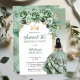 Elegant and classy sage green with gold-tone accents floral bough combined with an arched panel on a faded sage green background "Sweet 16" birthday party design. Features a dark brown to black-haired brunette beauty in a flowing sage-coloured ball gown and a faux alcohol and ink marbled back. Composite design by Holiday Hearts Designs.