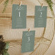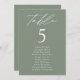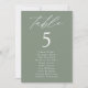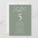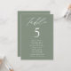 Elegant wedding seating chart featuring "table" displayed in white calligraphy script with the table number and guest names shown below on a sage green background. The design repeats on the back. To order the table number seating chart, edit each card with the table number and guest names and add it to your cart. Designed to coordinate with our Modern Elegance wedding collection.